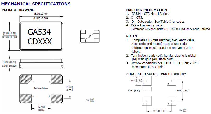CTS晶振,貼片晶振,GA534晶振.超小型表面貼片型SMD晶振,最適合使用在汽車電子領(lǐng)域中,也是特別要求高可靠性的引擎控制用CPU的時(shí)鐘部分.小型,超薄型具備強(qiáng)防焊裂性,石英晶體在極端嚴(yán)酷的環(huán)境條件下也能發(fā)揮穩(wěn)定的起振特性,產(chǎn)品本身具有耐熱,耐振,耐撞擊等優(yōu)良的耐環(huán)境特性,滿足無鉛焊接以及高溫回流溫度曲線要求,符合AEC-Q200標(biāo)準(zhǔn).
